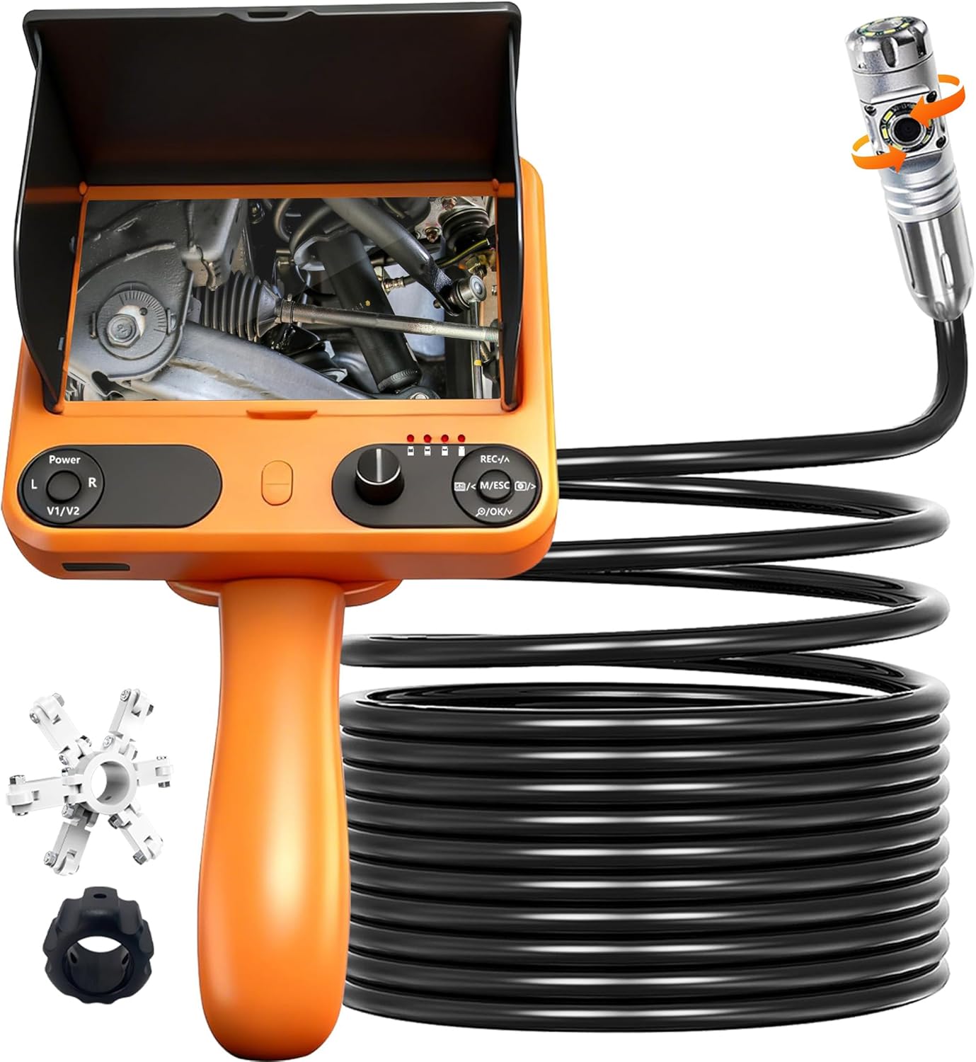 360° Rotating Dual-camera: Side 360° rotating camera (6 white lights), Front camera (6 white lights), The horizontal 360° rotation dual lens camera can capture a wider field of view and perform efficient and thorough inspections under various pipeline conditions